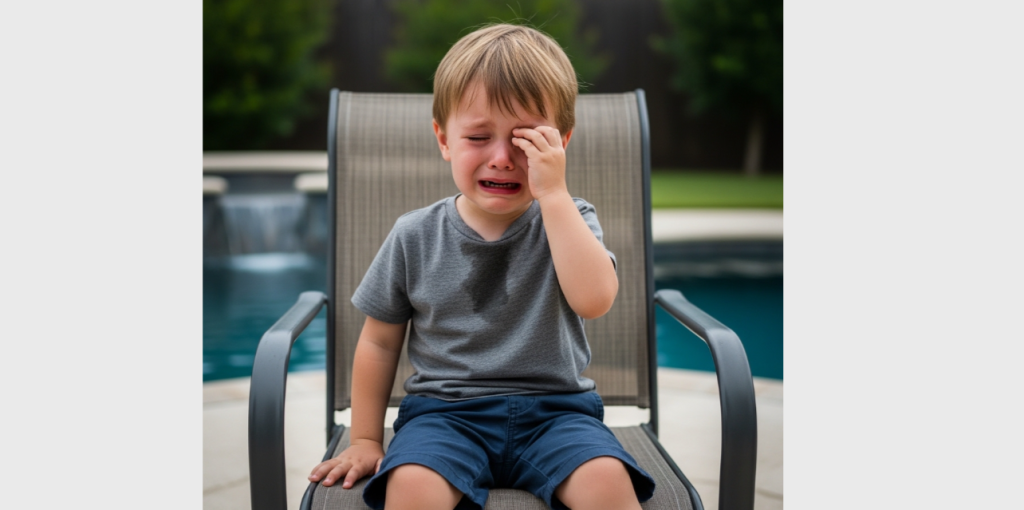 Timmy sat alone on a sun lounger about six meters away. He was wearing his old gray trousers and a simple T-shirt. No swimsuit. No toys. His small shoulders hunched forward as he stared at his bare feet.