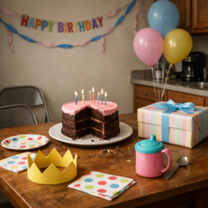 By noon, the apartment was transformed. Streamers in pink and purple crisscrossed the ceiling. A hand-lettered banner reading “Happy 5th Birthday Lily!” hung over the couch. Dollar-store tablecloths covered our hand-me-down furniture. The cake sat in the refrigerator, frosted in pink with purple flowers I’d painstakingly piped around the edges. It wasn’t professional, but it was made with love.