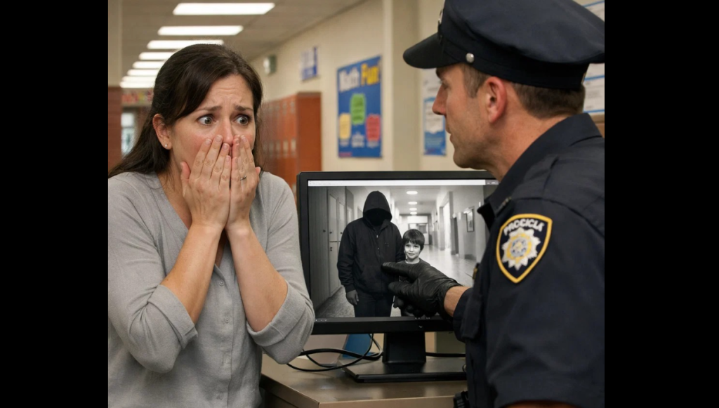The woman turned the corner toward Lucas’s classroom. The camera angle caught the side of her face briefly—nothing more than a jawline, a glimpse of chin. Then she slipped inside his classroom during the early minutes of homeroom.