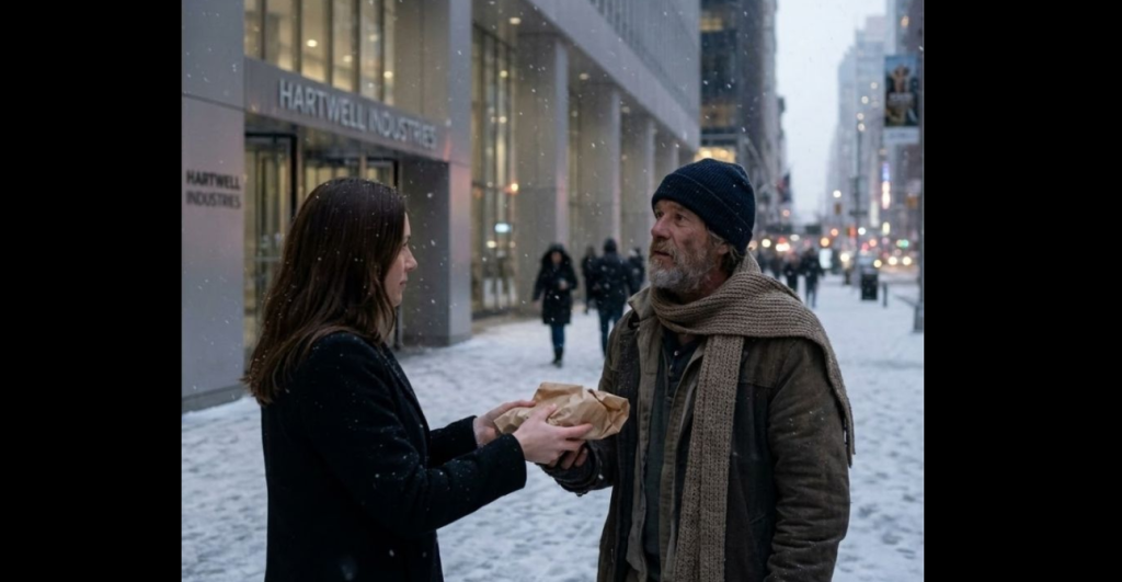 Thirty minutes later, Megan stood outside Hartwell Industries holding a box of her belongings, tears freezing on her cheeks. The homeless man was gone. The spot where he had sat was empty.