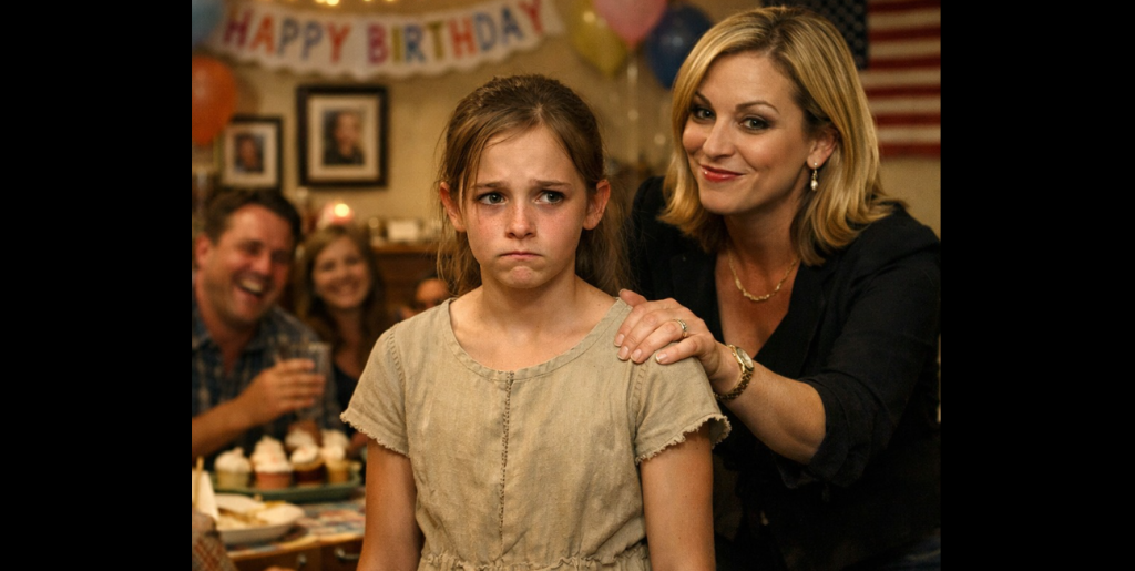 She stood there in the center of the room, held in place by a hand that was supposed to be family, absorbing humiliation like she’d already learned that reacting would make it worse.