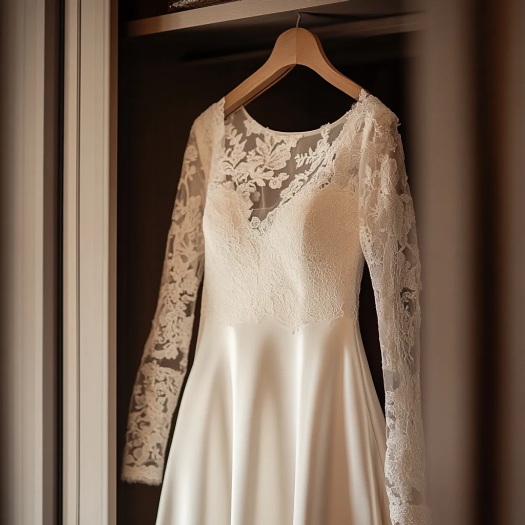 The ivory satin fabric caught the light like water, while the delicate lace sleeves looked like they were made by angels.